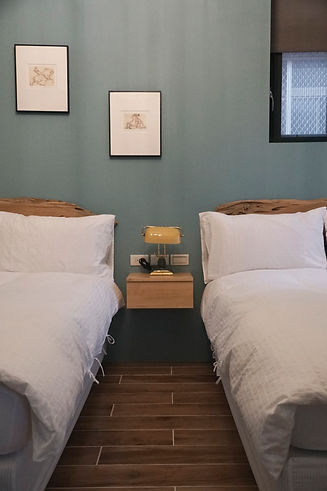 兩面開窗,西面窗可以眺望花蓮溪及巍峨中央山脈。臥房和風風格設計,以一個圓盤大型吊燈做設計主角,溫暖鵝黃光暈渲染整個室內,地毯兩張坐墊配一張古灰色實木茶几,已足以放鬆一半旅遊疲憊。乾溼分離衛浴,並附有淋浴及浴缸,更能快速恢復精神,迎接明日的旅程。